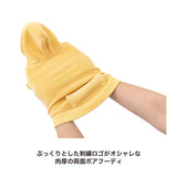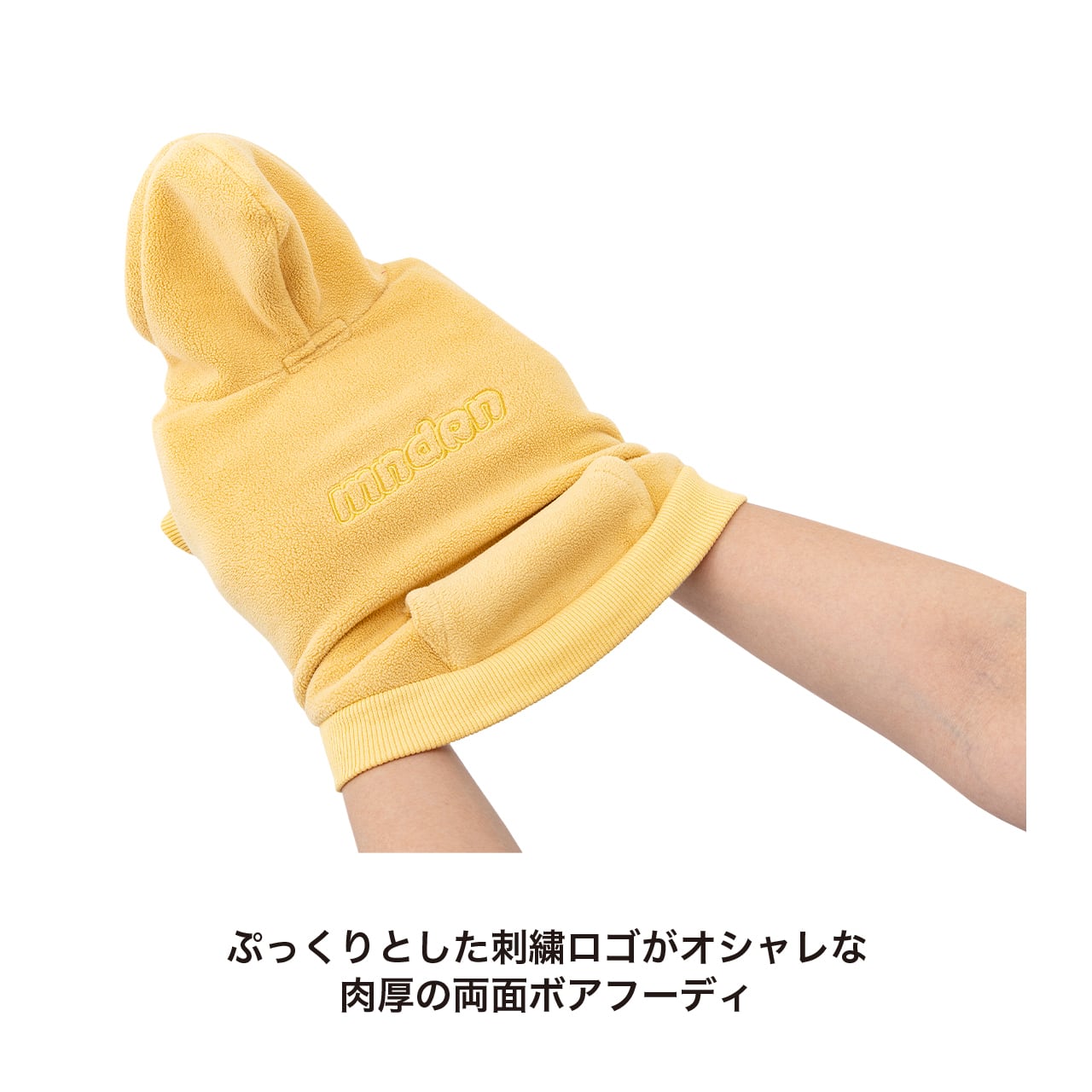 背中の立体的にぷっくりした刺繍ロゴと配色のドローコードがアクセントの肉厚両面ボアフーディ